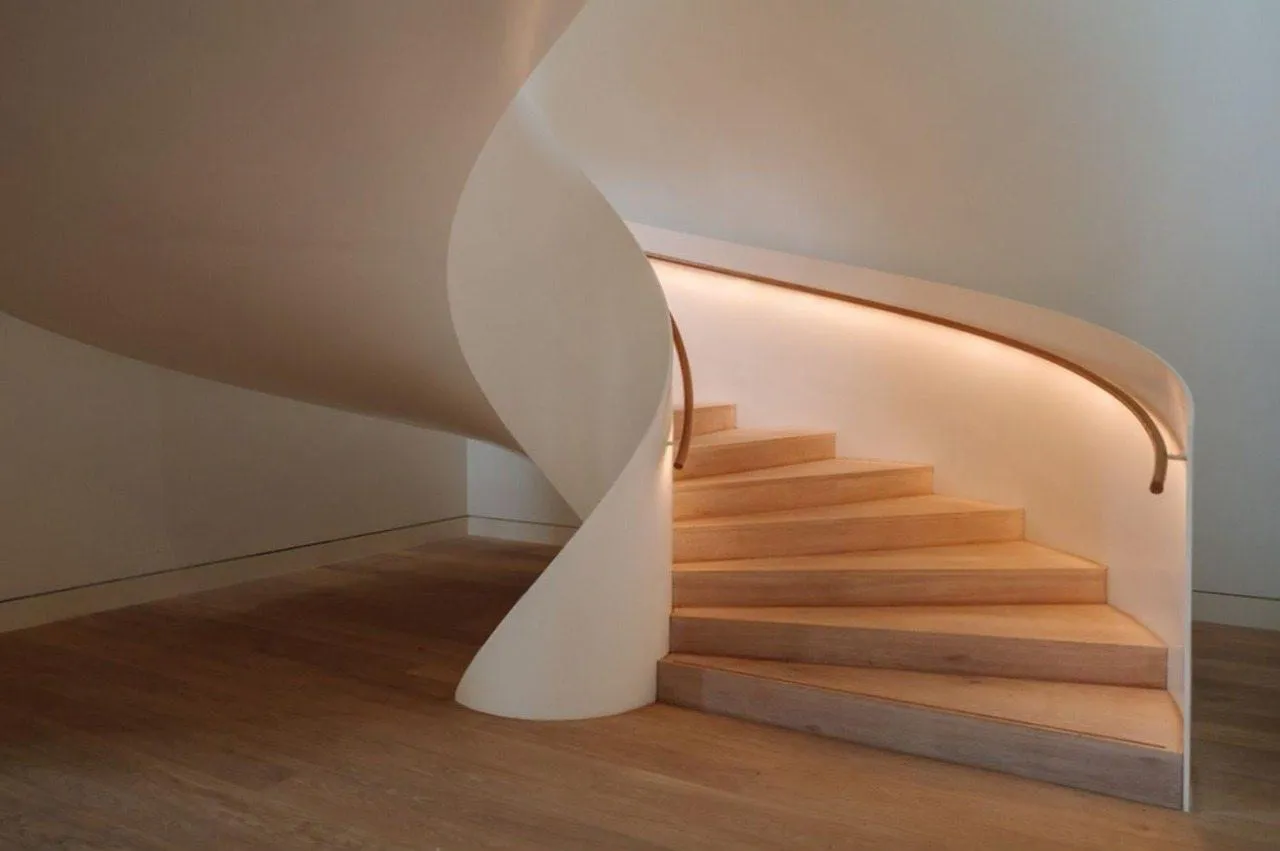 Когда лестница перестает быть просто способом перемещения и превращается в произведение искусства, интерьер обретает душу. Этот проект — воплощение смелой дизайнерской мысли: сложная геометрия, напоминающая застывшую в движении ленту, стала центральной осью всего пространства. Гармоничное сочетание теплых деревянных ступеней и футуристичной подсветки поручней создает поистине статусный и незабываемый образ.